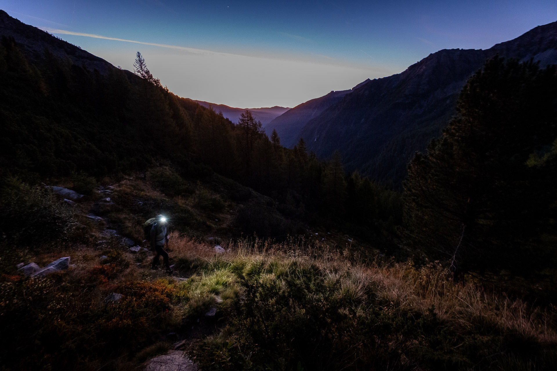 Času máme sice víc, ale ne na rozdávání. S posledním světlem odbočujeme z Maltatalu do bočního údolí Gößgraben a dojíždíme na známé parkoviště, kde se jako mnozí jiní obratem ukládáme ke spánku. V plánu máme Jižní pilíř na Hochalmspite a protože jsme před lety s Lukym empiricky zjistili, že je na takovou túru jeden den až až, volíme stejnou taktiku i tentokrát. Vycházíme ještě za tmy a čelovky vypínáme až na dohled Gießener Hütte.