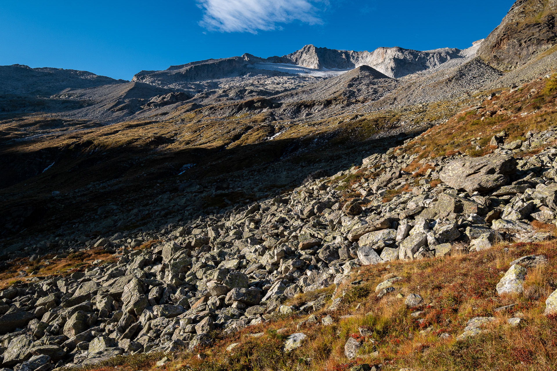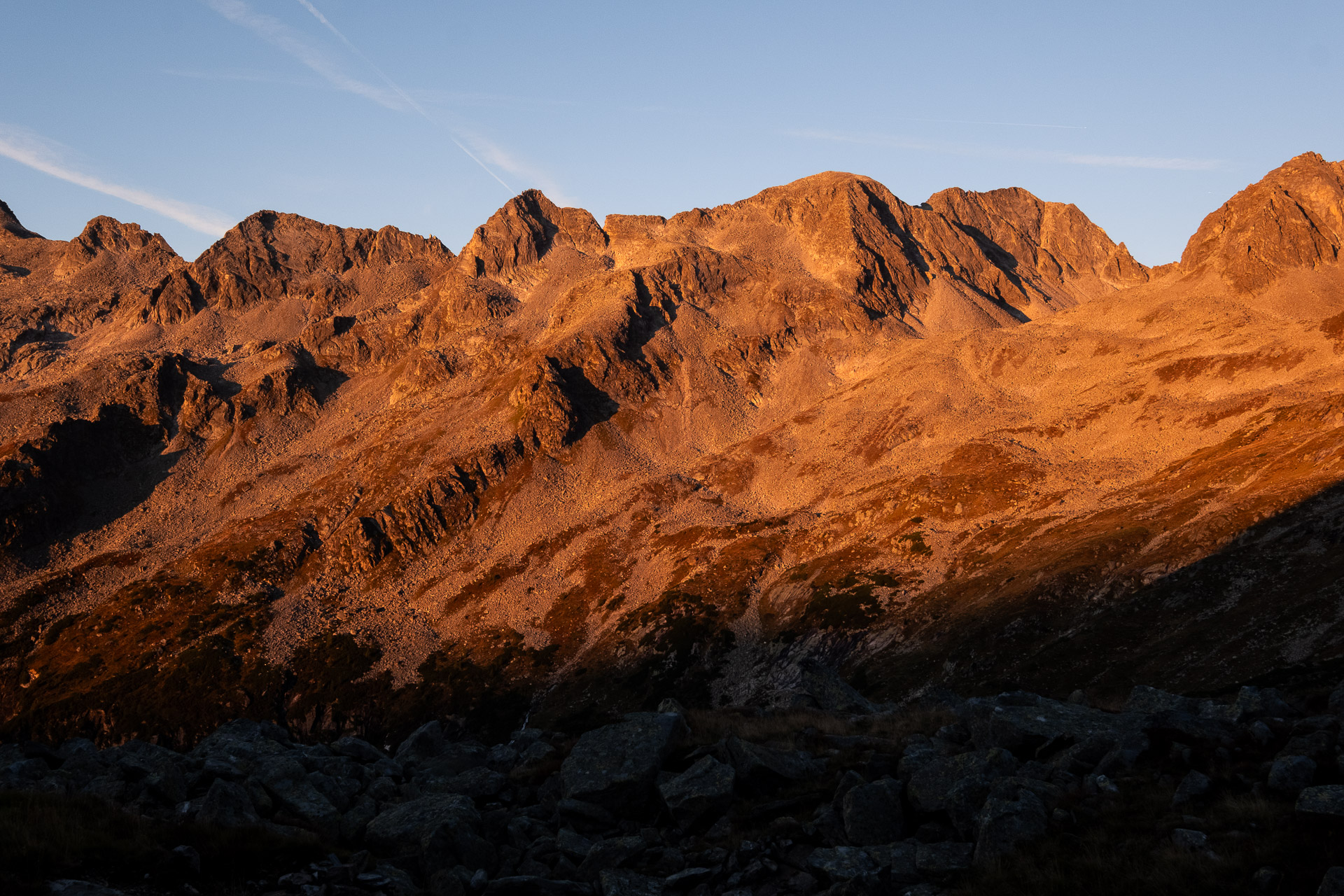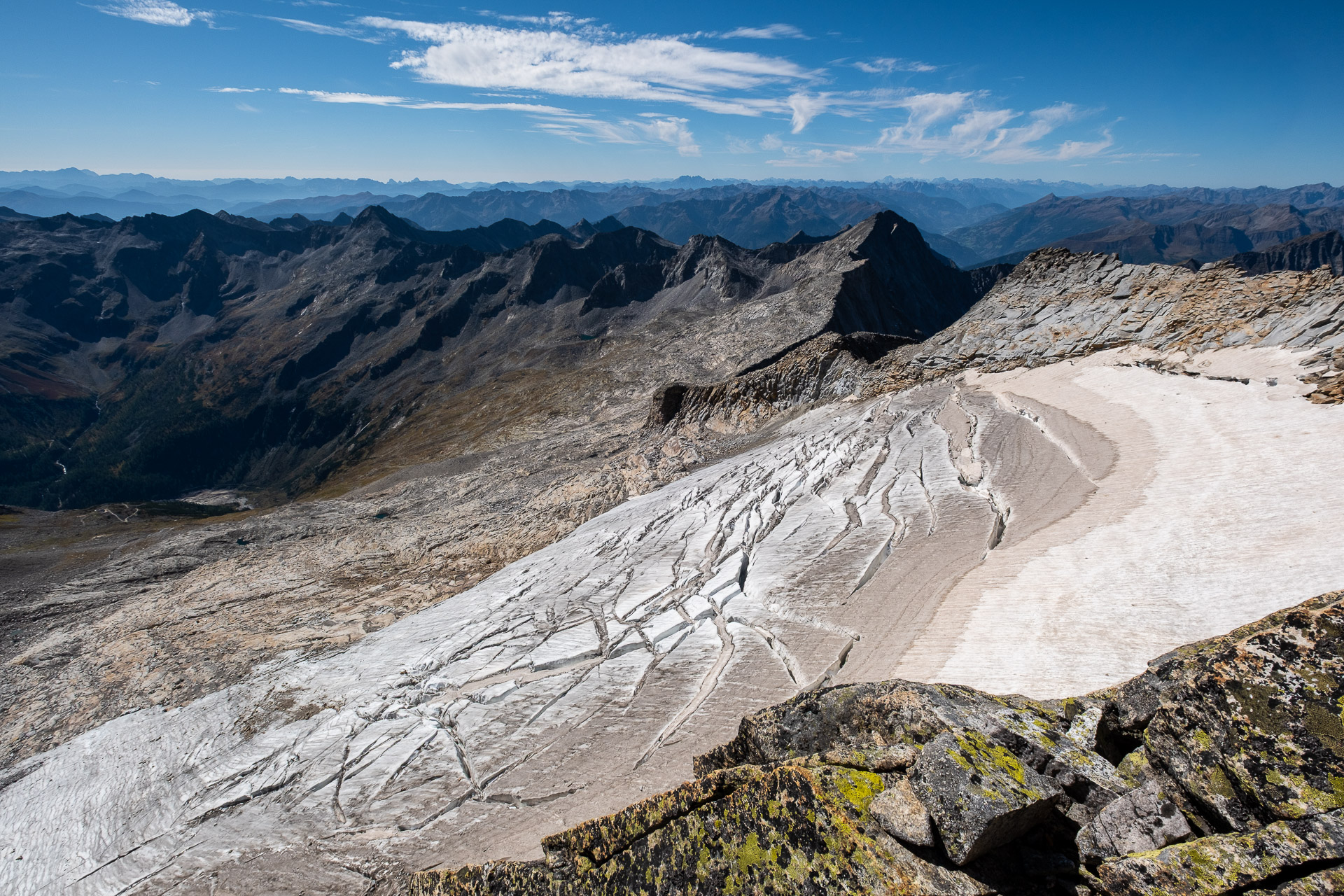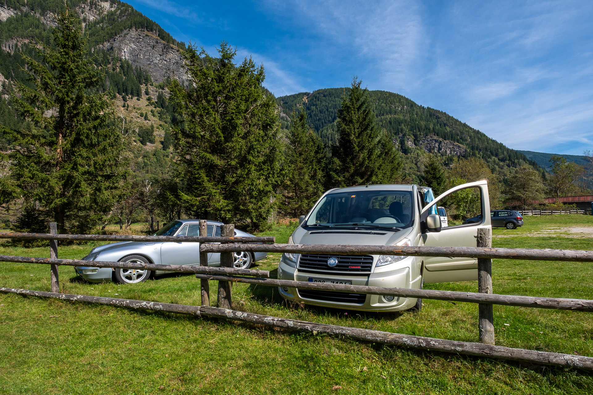 Po ferratě to jde dobře, den pořád jak obrázek, ale už začínáme cítit únavu. Sručkujeme po drátu do Lassacher Winkelscharte, zamáváme srpnovému Seebachtalu a skutálíme se už s notně unavenýma nohama ke Gießener Hütte. Na rekonstrukcí rozbombardované chatě ulovíme osvěžení a k autu přicházíme už za šera. Kolem parkoviště obchází místní nerudný sedlák a tak pro sichr sjíždíme ještě serpentinami dolů a přespáváme u mostu.