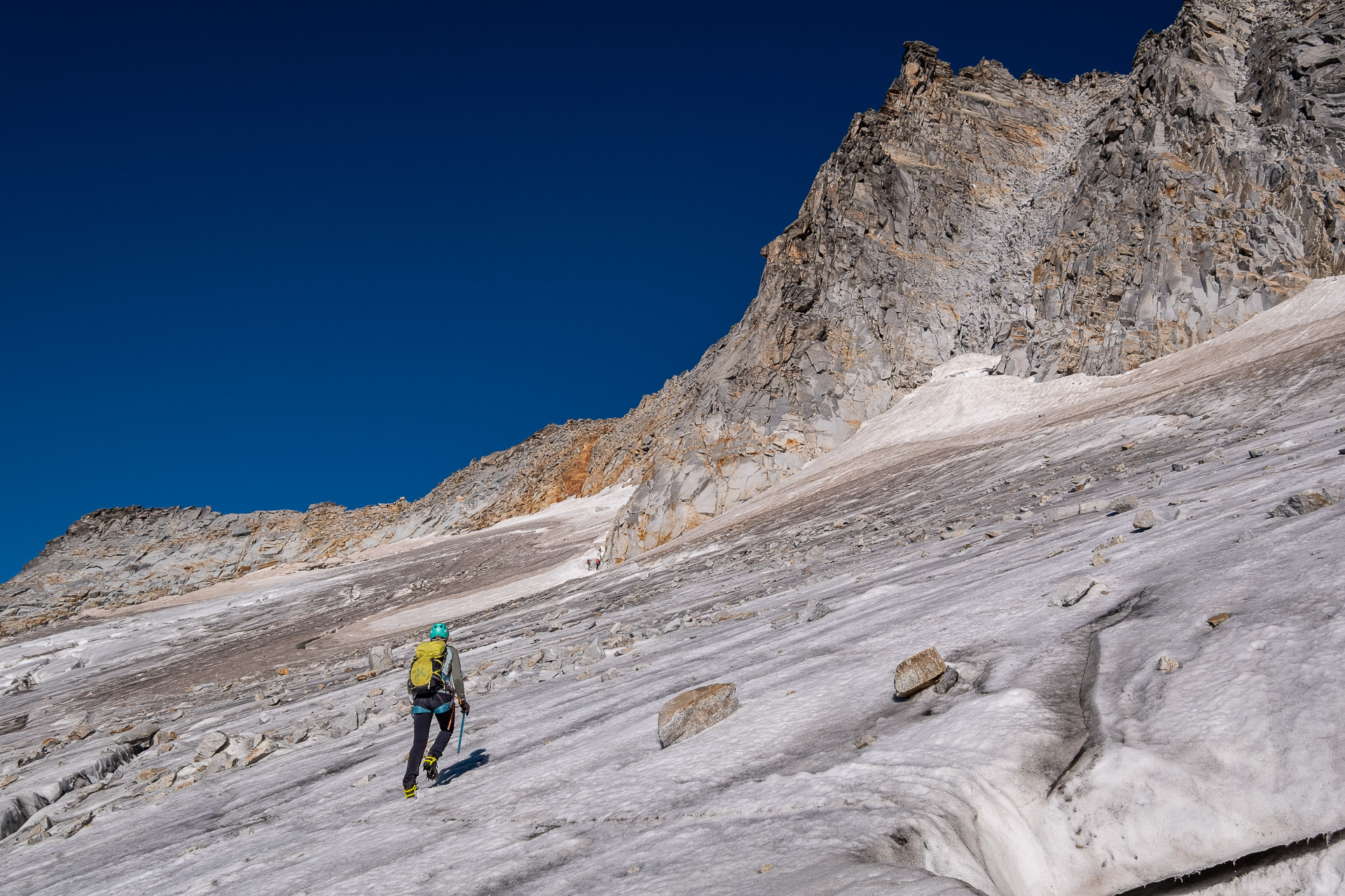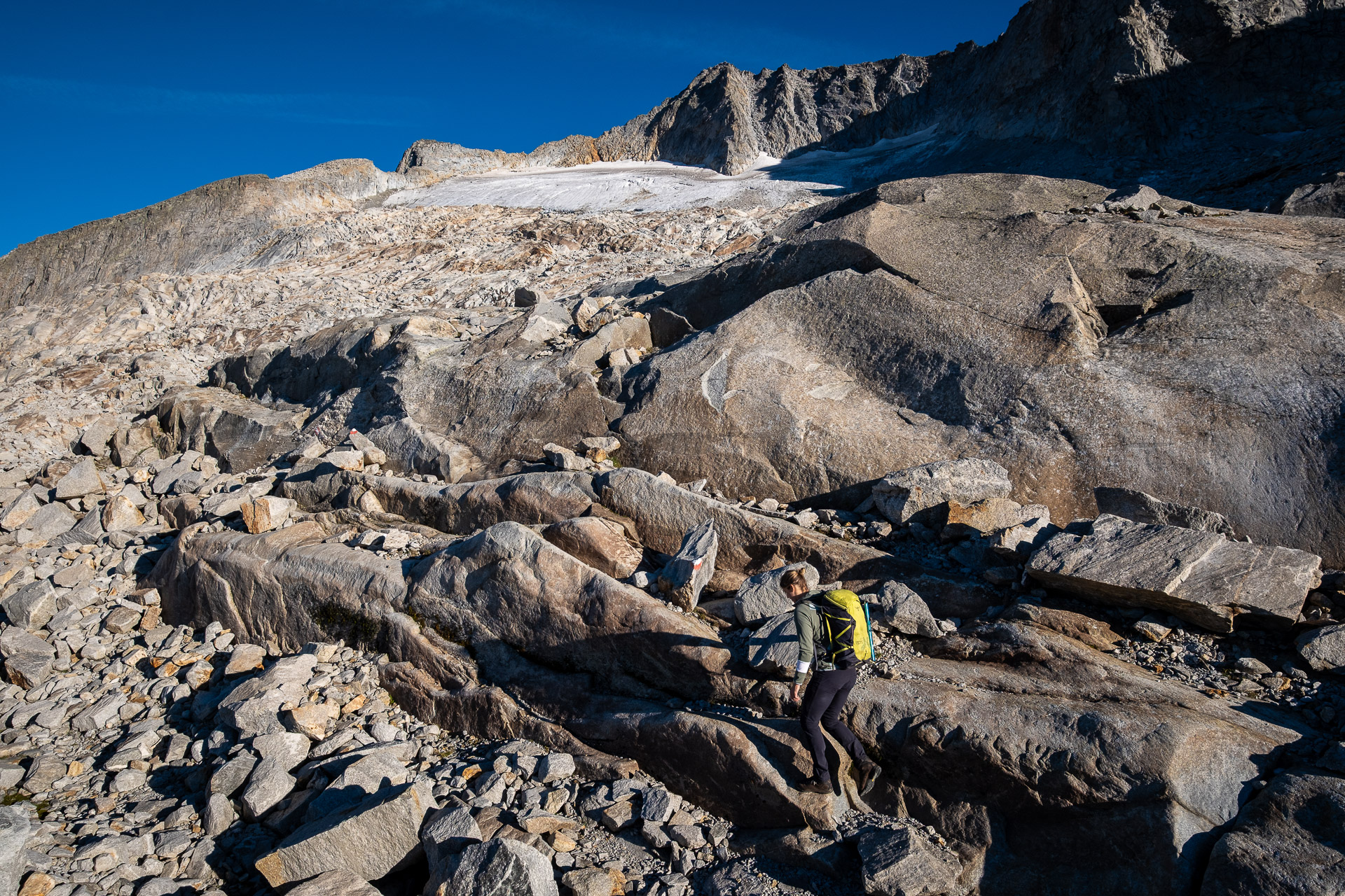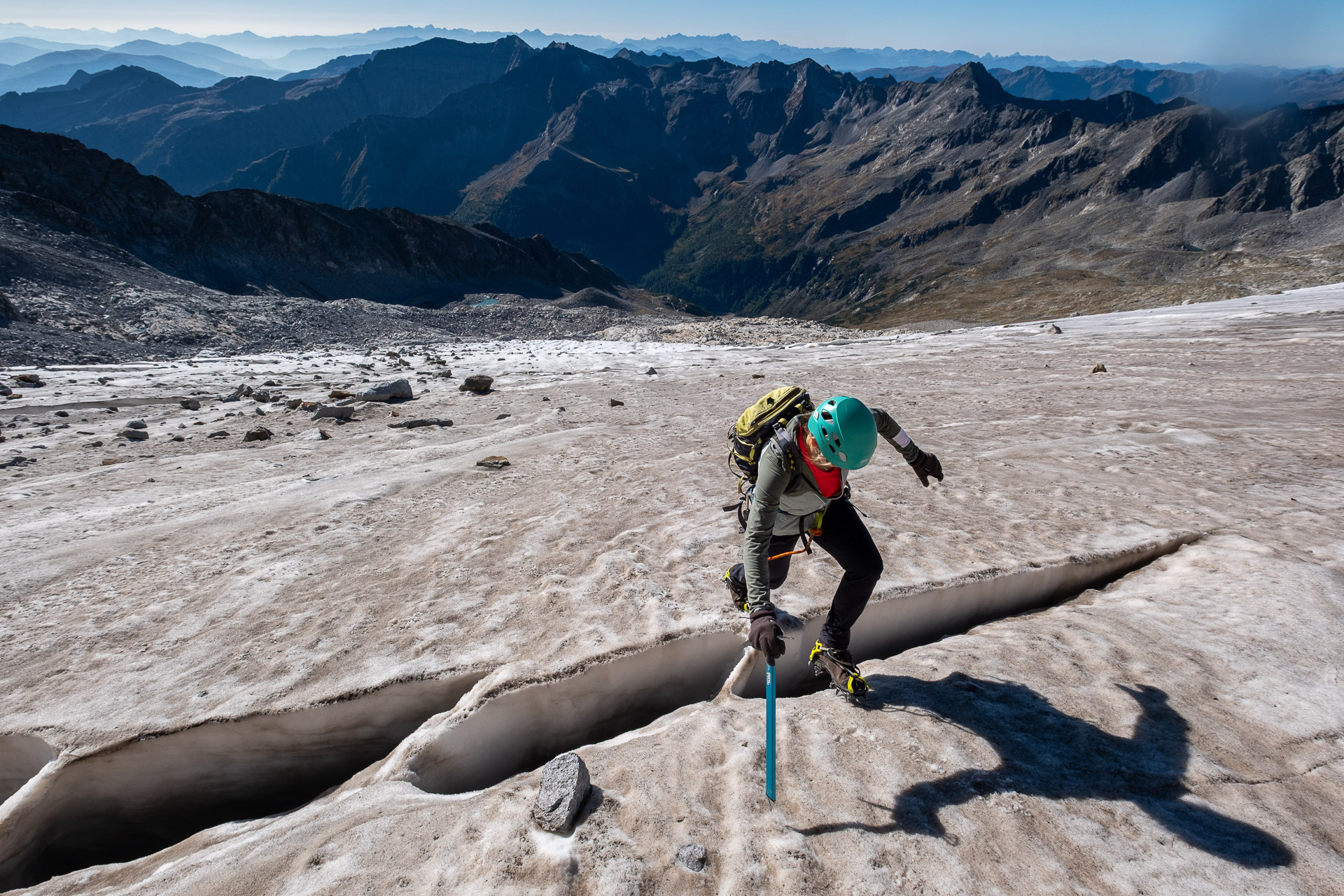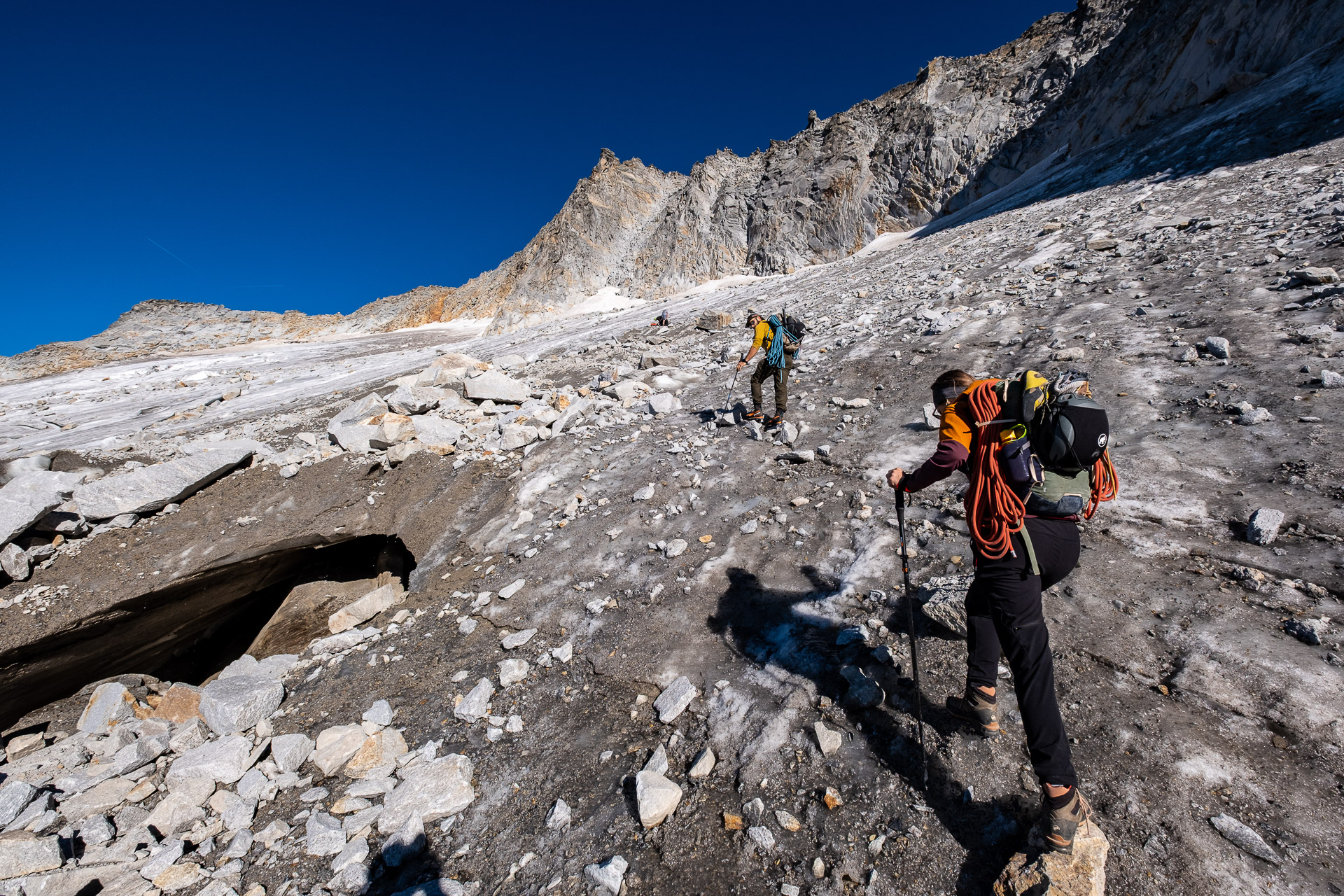 Čtyřhodinový nástup není nic pro sportovkáře, ale nás, vandráky, neuráží. Počko je tutový, ledovec hodnej a náladu lehce nahlodává jen občasný pád kamenů z výše položených svahů. Nasadíme blembáky, rychle to proběhneme a už stepujeme pod nástupem.