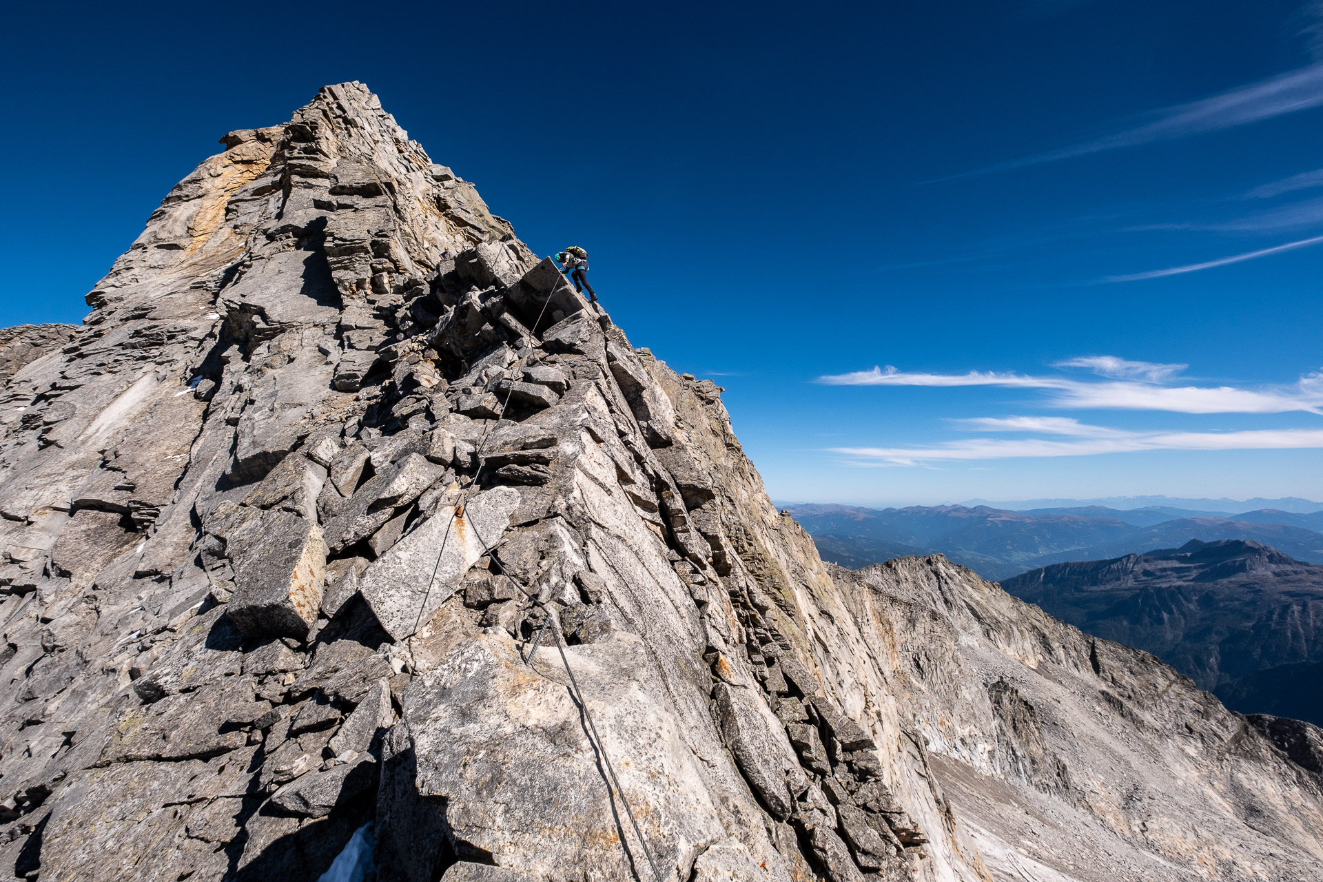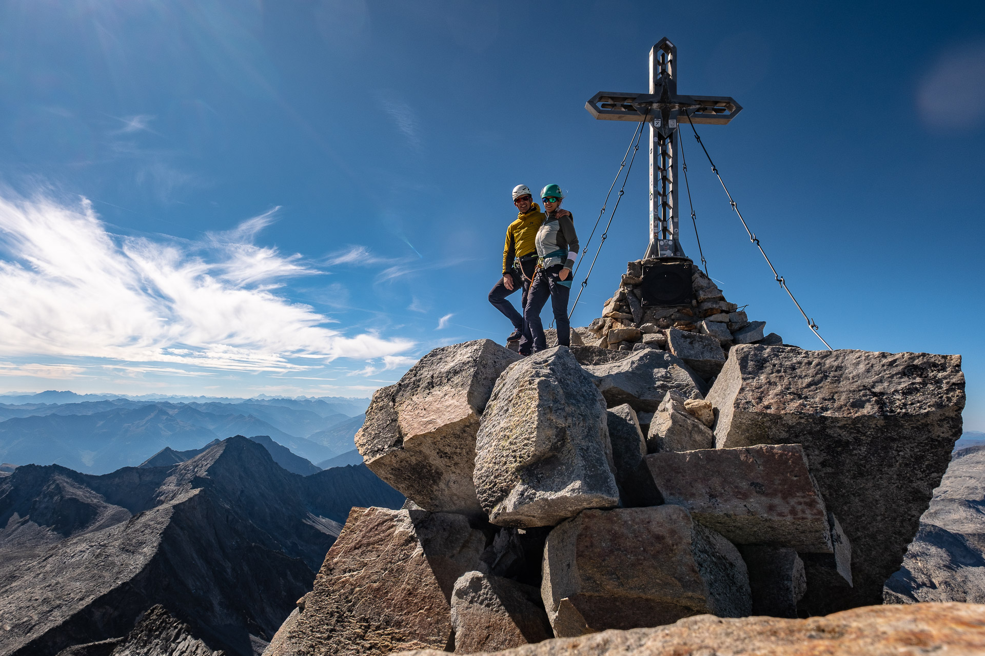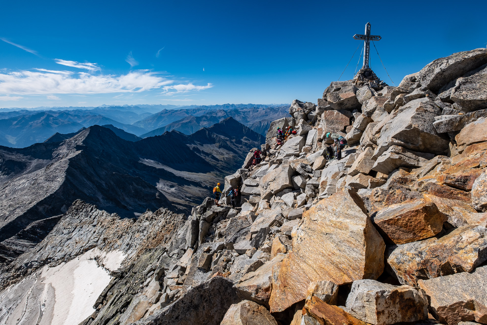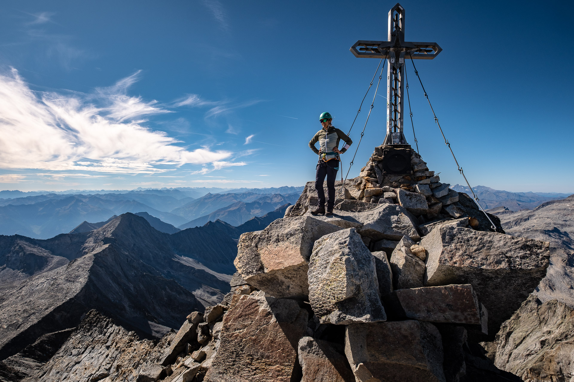Závěr lezení už bereme na průběh. Kristinka nejdřív projevuje rozpaky, které jen podpoří krátký a nepříjemný úsek slézání, ale vbrzku už se zdravíme s křížem a skupinkami, které tu potkáváme. Chvíli v baboletním počasí rozjímáme, ale víme, že to, co jsme si dneska vylezli, musíme také slézt. A že toho není málo. Sestup normálkou přes Steinerne Mandl není aktuálně kvůli riziku pádu kamení doporučený a tak, stejně jako všichni ostatní, sestupujeme do ferratě hřebenem Detmolder.
