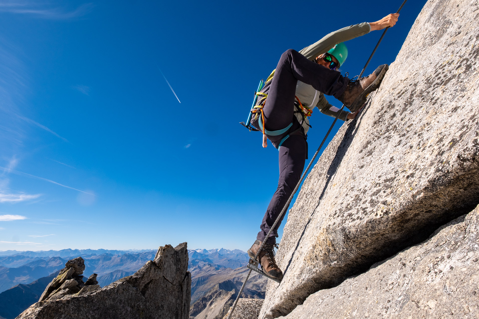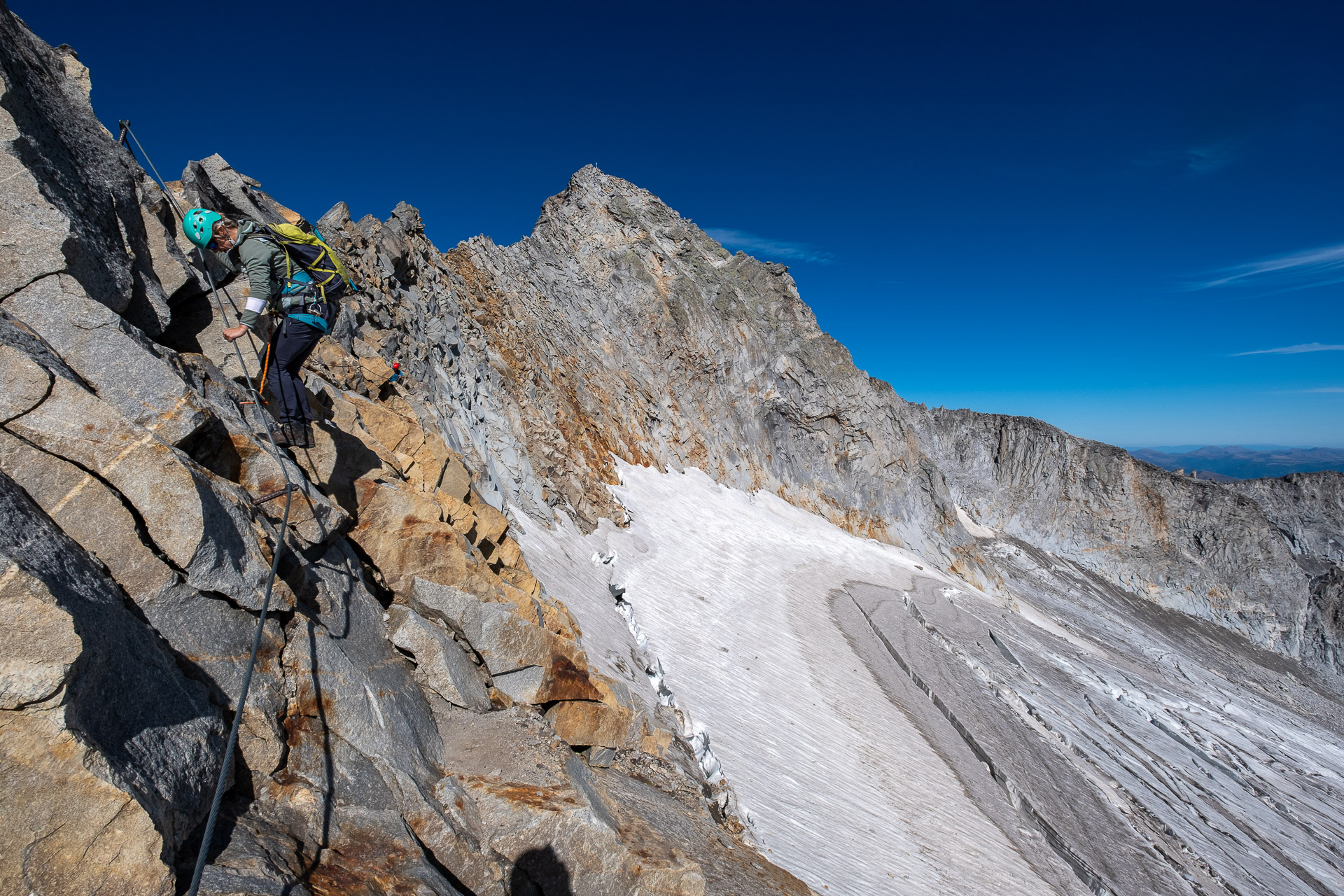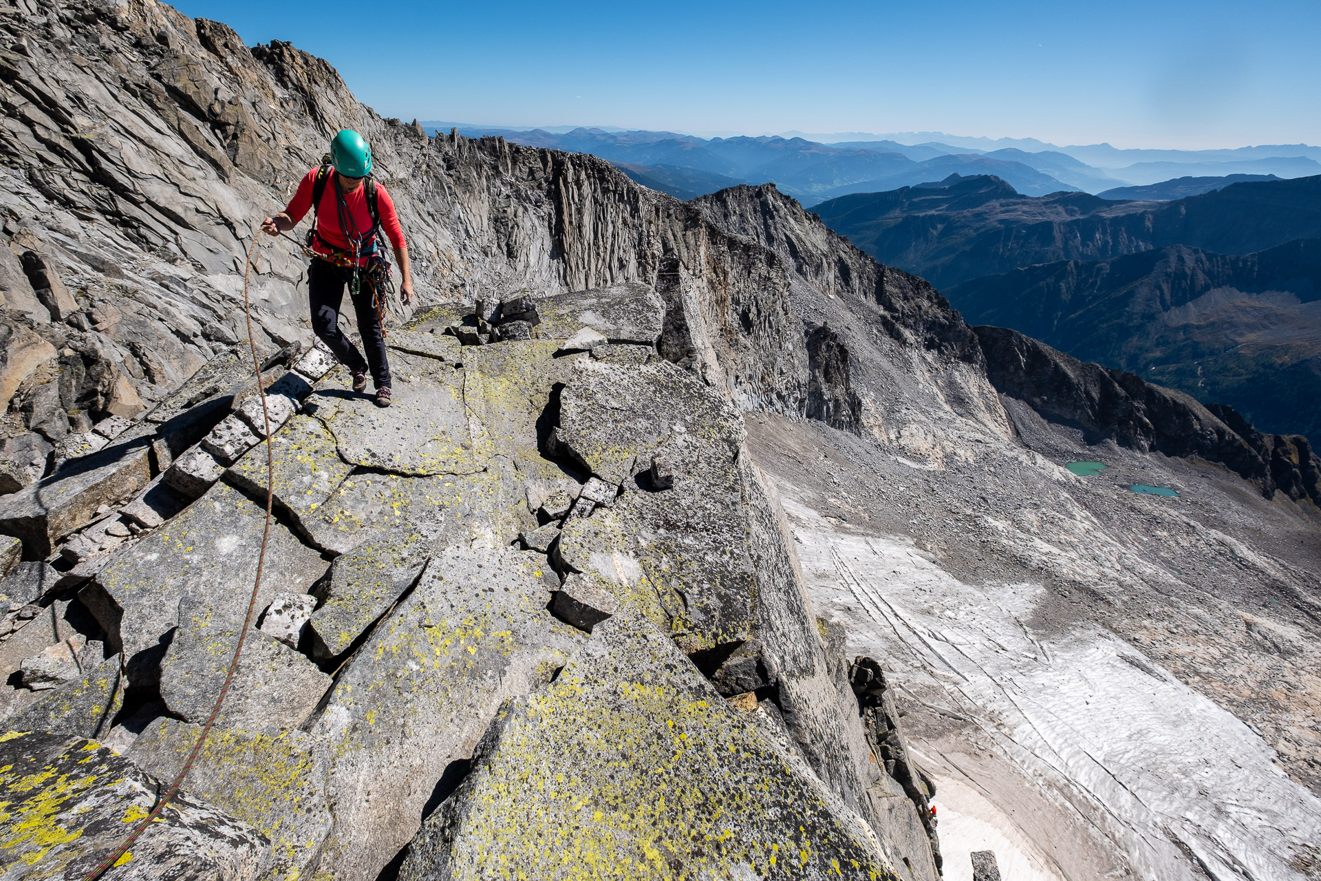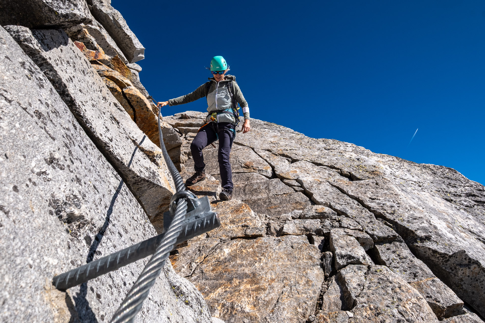 Závěr lezení už bereme na průběh. Kristinka nejdřív projevuje rozpaky, které jen podpoří krátký a nepříjemný úsek slézání, ale vbrzku už se zdravíme s křížem a skupinkami, které tu potkáváme. Chvíli v baboletním počasí rozjímáme, ale víme, že to, co jsme si dneska vylezli, musíme také slézt. A že toho není málo. Sestup normálkou přes Steinerne Mandl není aktuálně kvůli riziku pádu kamení doporučený a tak, stejně jako všichni ostatní, sestupujeme do ferratě hřebenem Detmolder.
