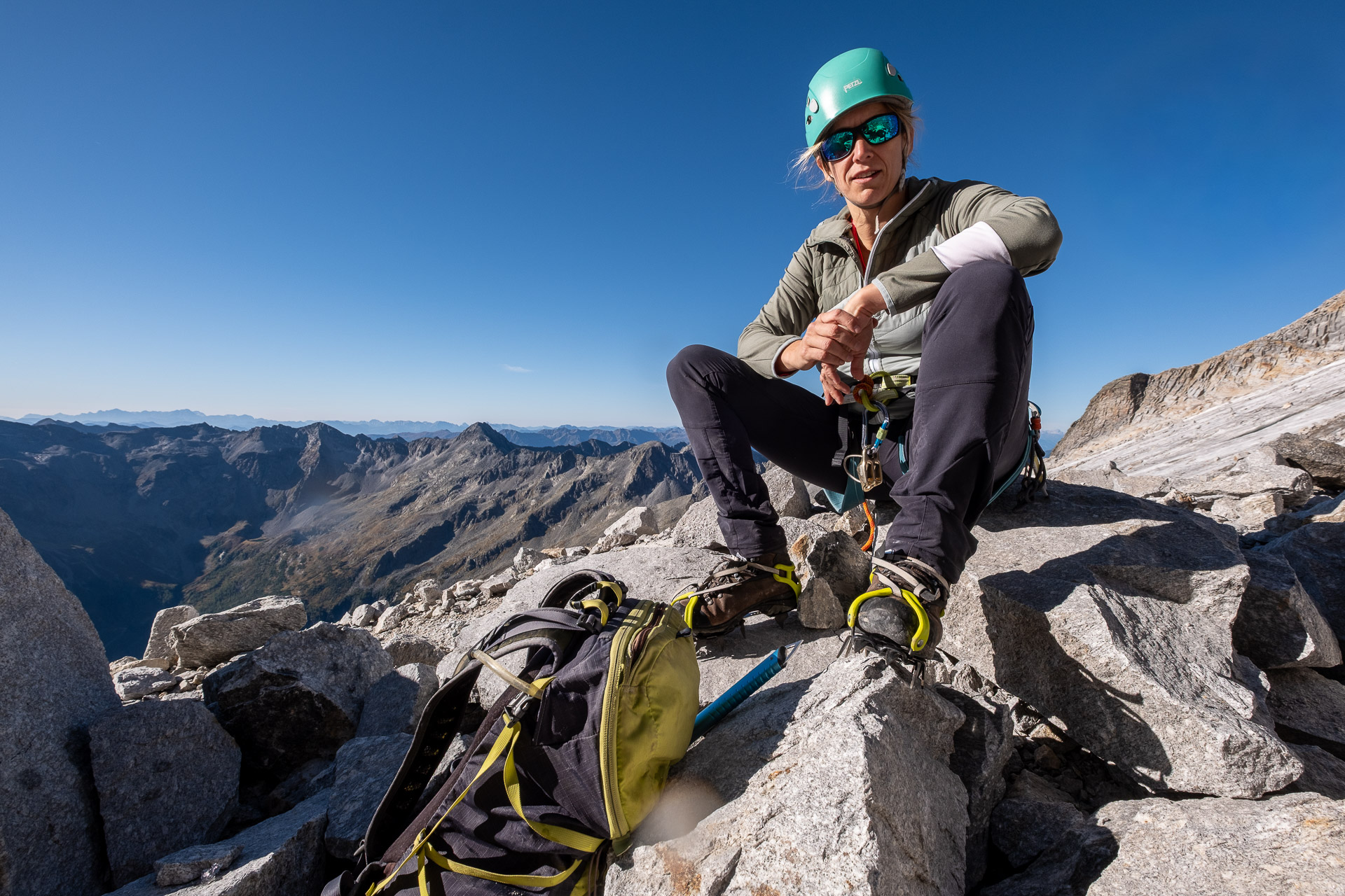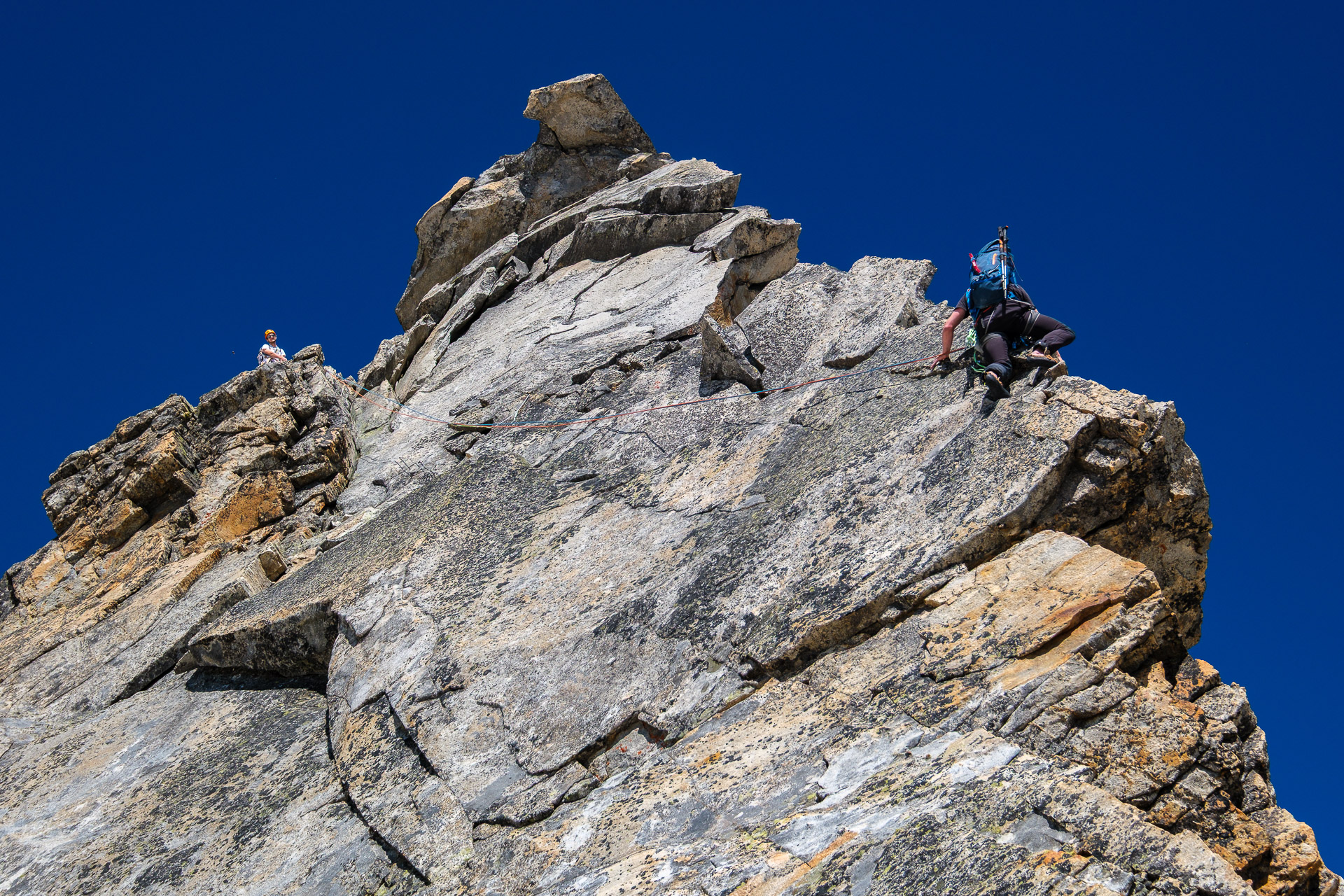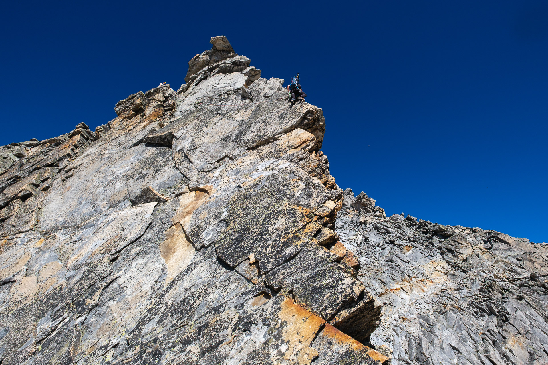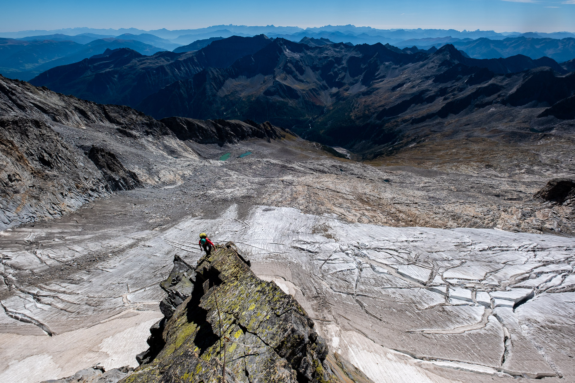 Závěr lezení už bereme na průběh. Kristinka nejdřív projevuje rozpaky, které jen podpoří krátký a nepříjemný úsek slézání, ale vbrzku už se zdravíme s křížem a skupinkami, které tu potkáváme. Chvíli v baboletním počasí rozjímáme, ale víme, že to, co jsme si dneska vylezli, musíme také slézt. A že toho není málo. Sestup normálkou přes Steinerne Mandl není aktuálně kvůli riziku pádu kamení doporučený a tak, stejně jako všichni ostatní, sestupujeme do ferratě hřebenem Detmolder.