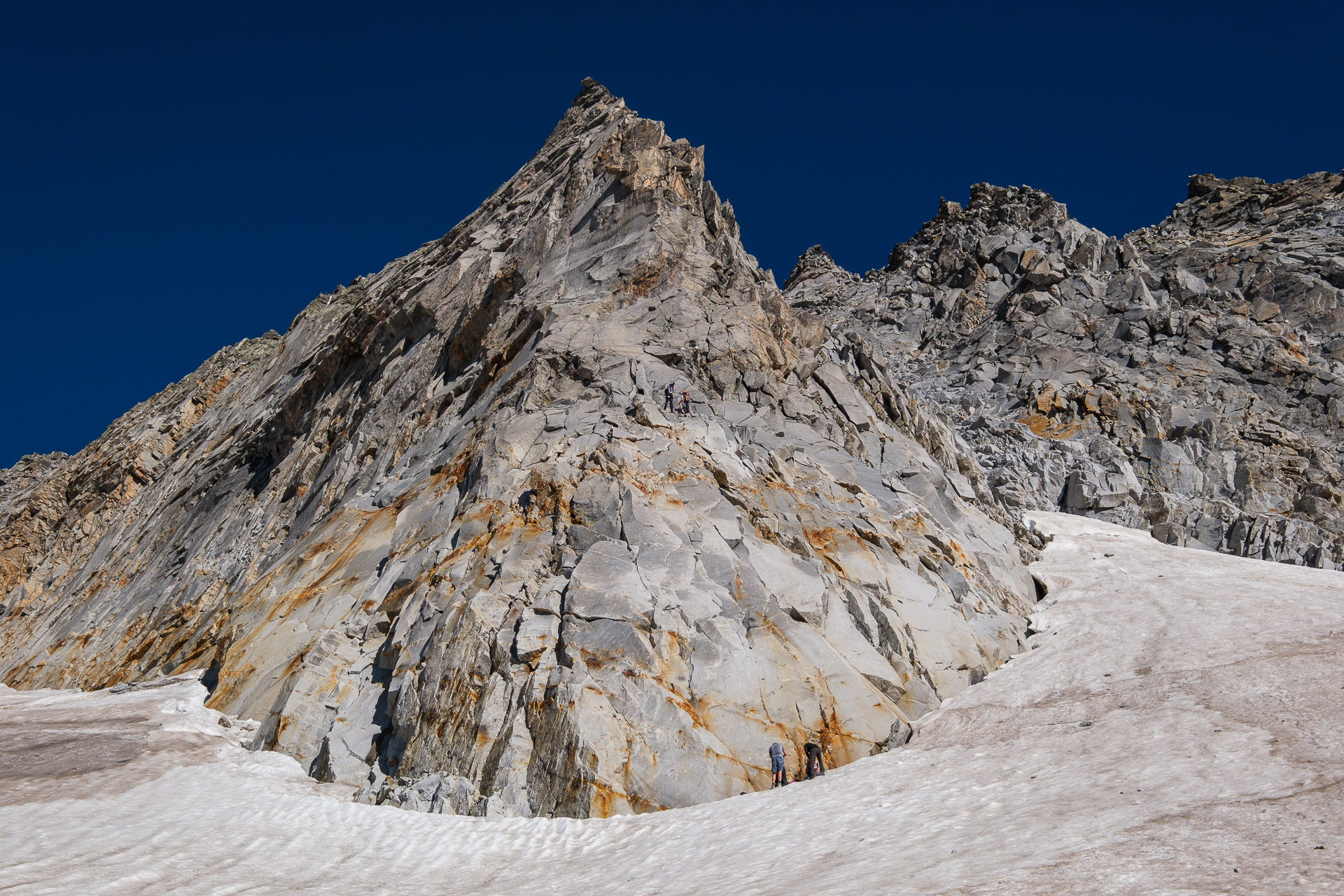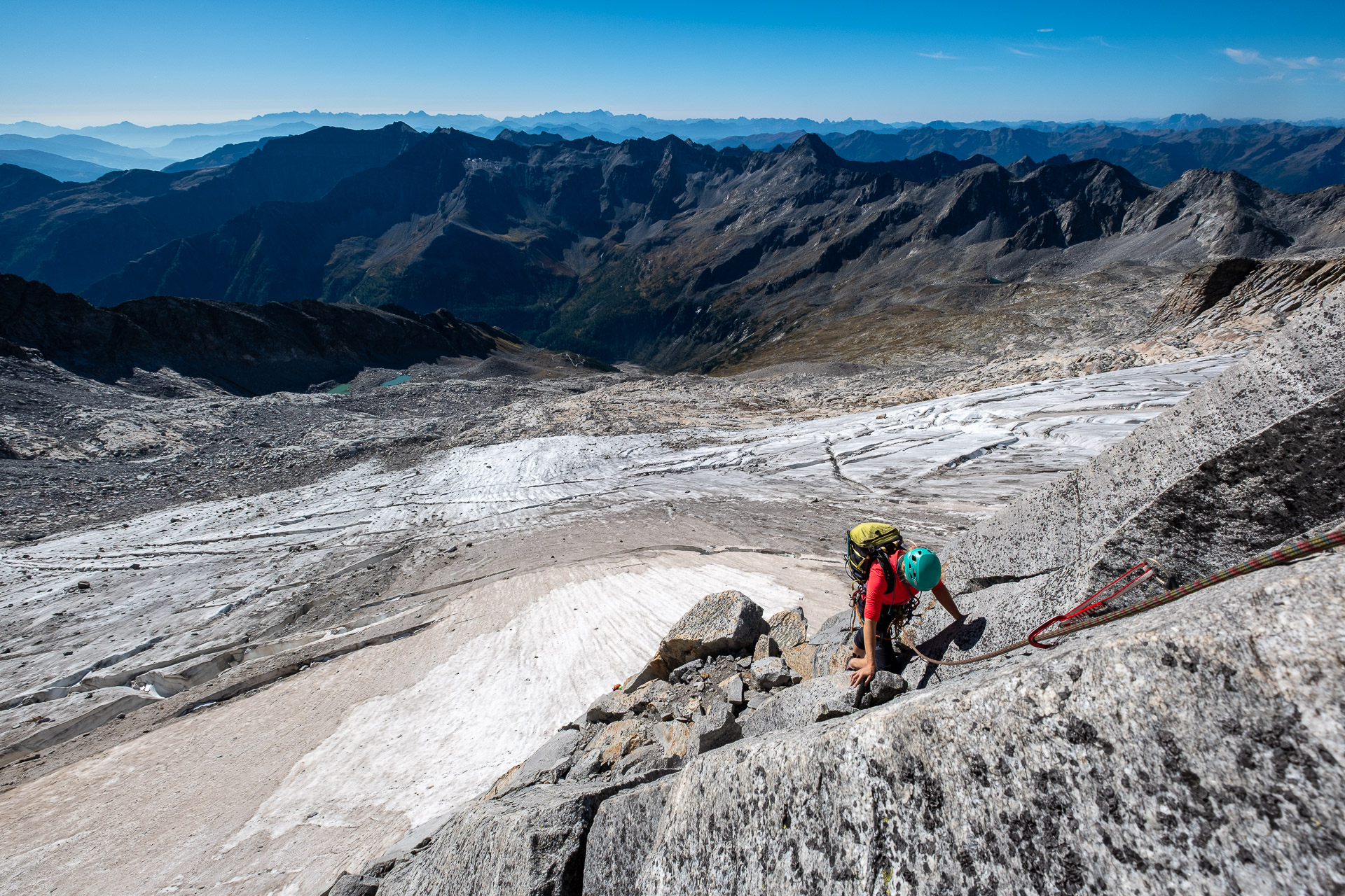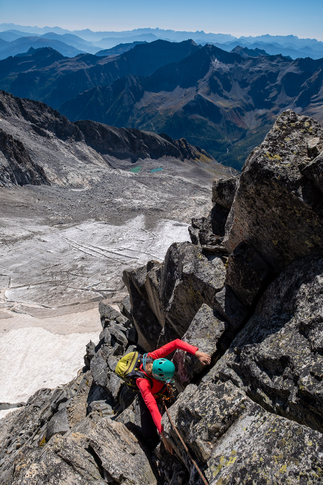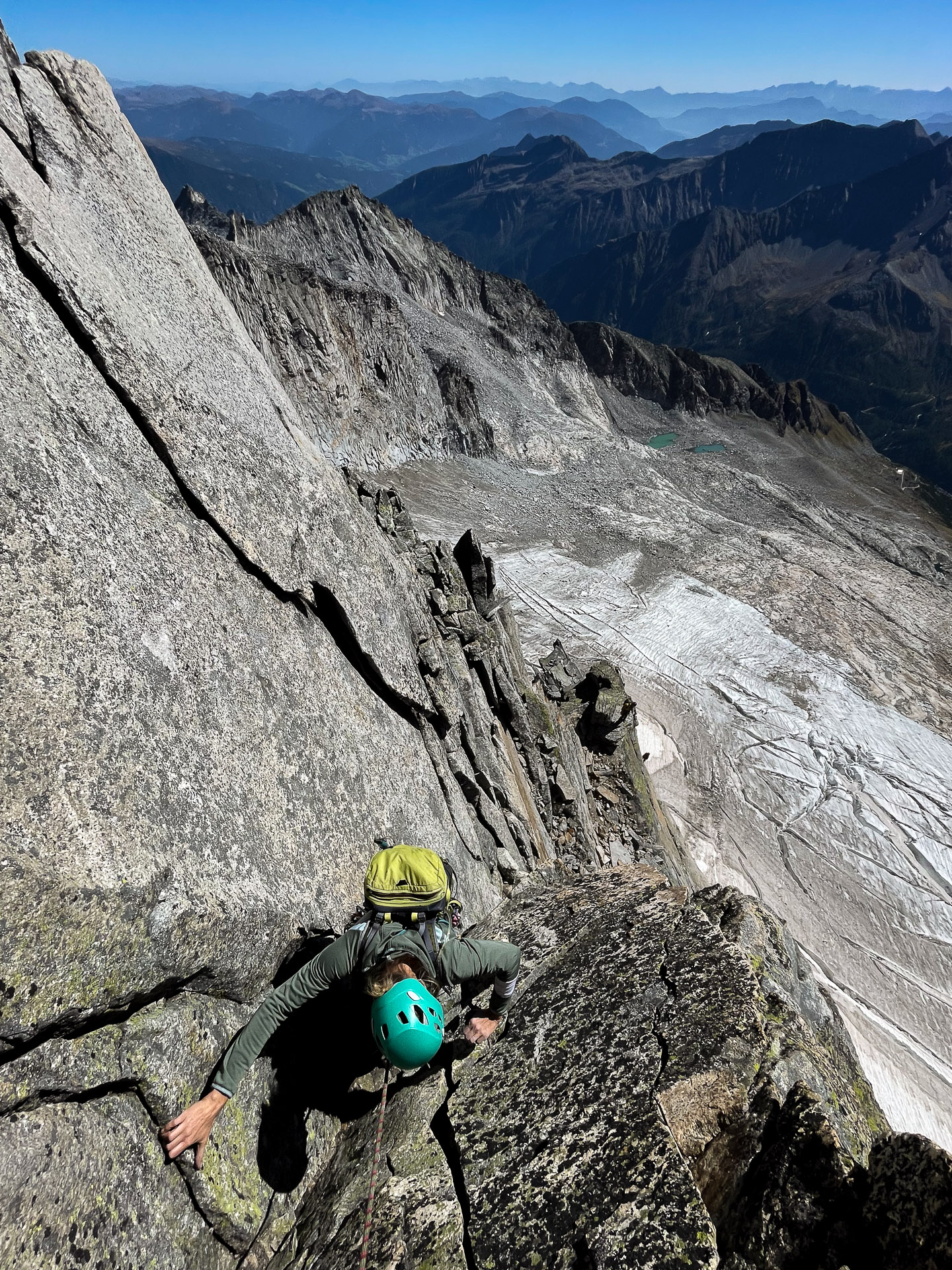 Závěr lezení už bereme na průběh. Kristinka nejdřív projevuje rozpaky, které jen podpoří krátký a nepříjemný úsek slézání, ale vbrzku už se zdravíme s křížem a skupinkami, které tu potkáváme. Chvíli v baboletním počasí rozjímáme, ale víme, že to, co jsme si dneska vylezli, musíme také slézt. A že toho není málo. Sestup normálkou přes Steinerne Mandl není aktuálně kvůli riziku pádu kamení doporučený a tak, stejně jako všichni ostatní, sestupujeme do ferratě hřebenem Detmolder.