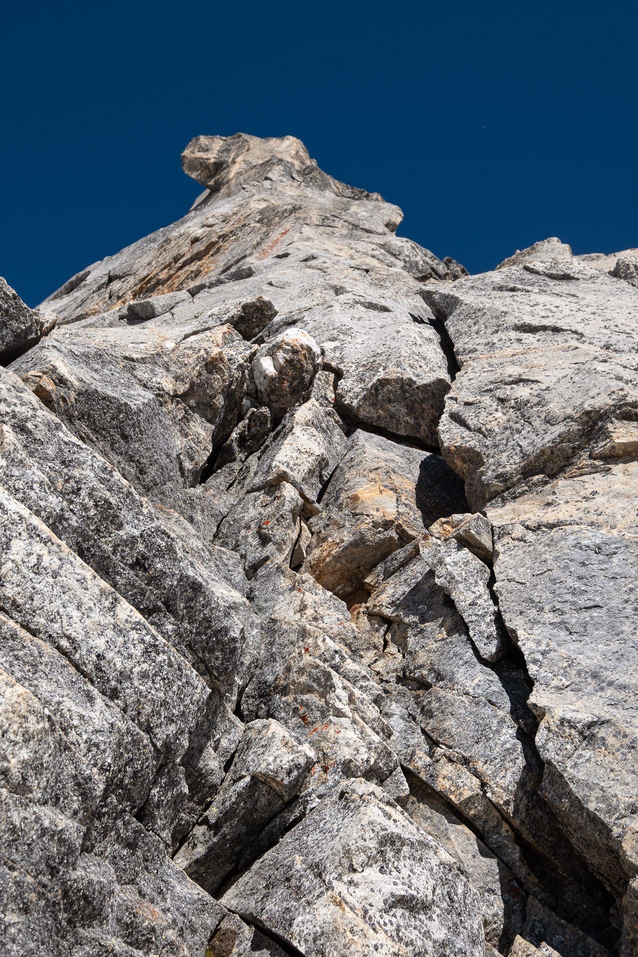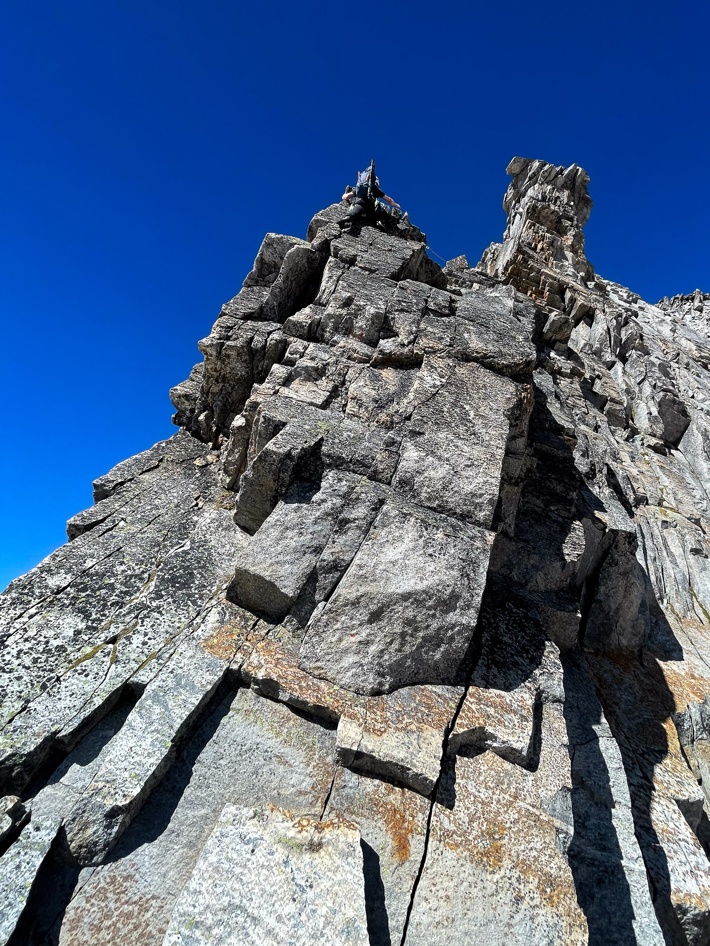 Druhá, třetí a čtvrtá délka vedou z východní strany pilíře a jedná se o typické horské lezení, které není nijak obtížné, ale je třeba trochu hledat a všechno si pěkně odjistit po vlastním. V závěru čtvrté délky se vyhoupneme na hranu jižního pilíře na komfortní plošinu, na které by se pohodlně postavil i rodinný stan s předsíňkou.