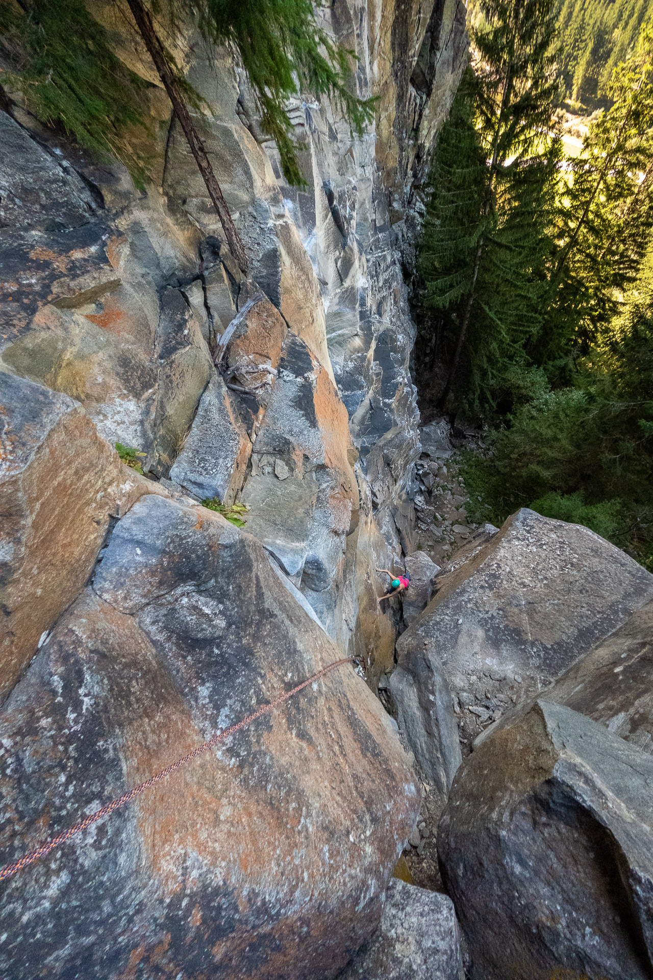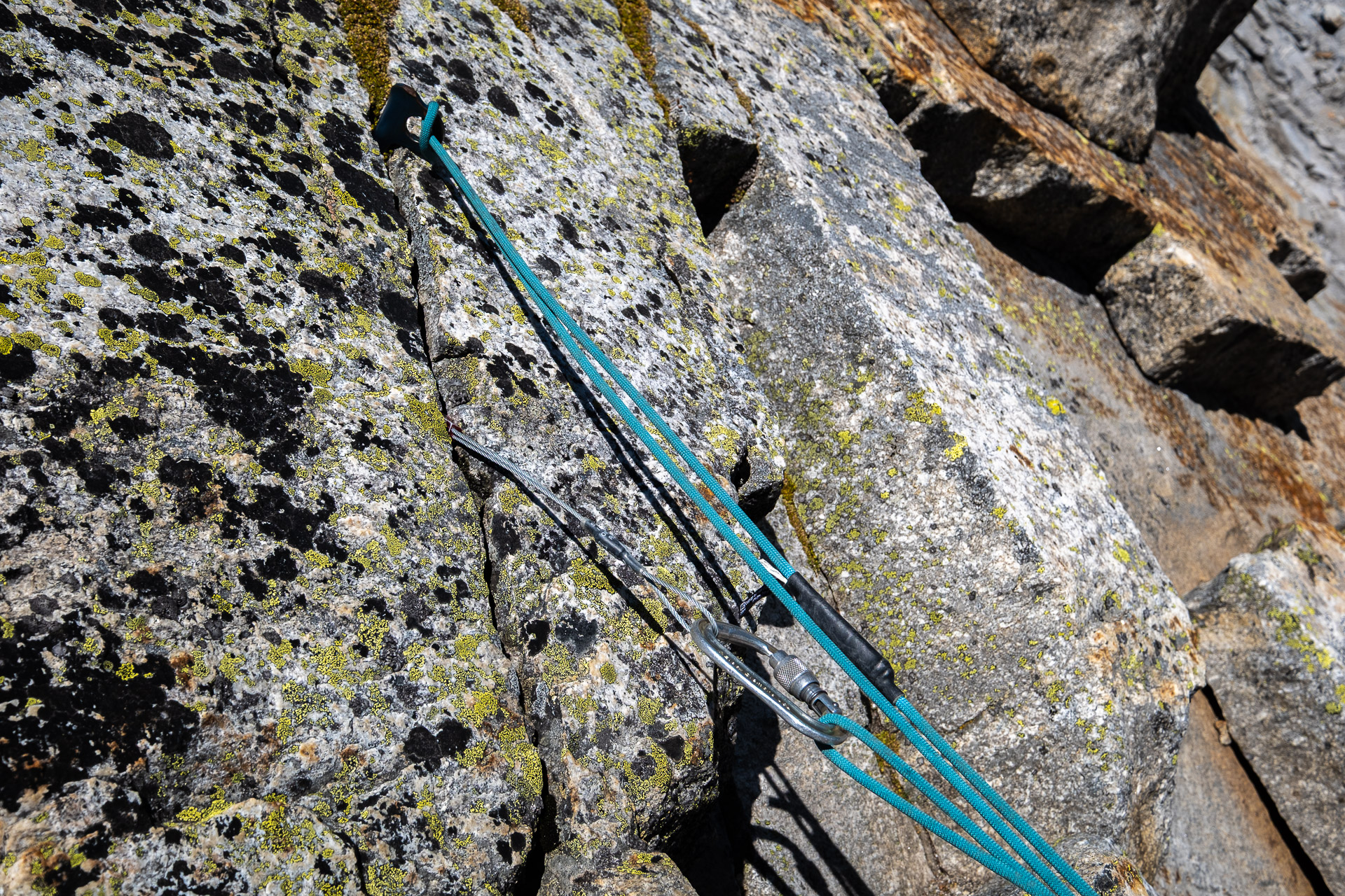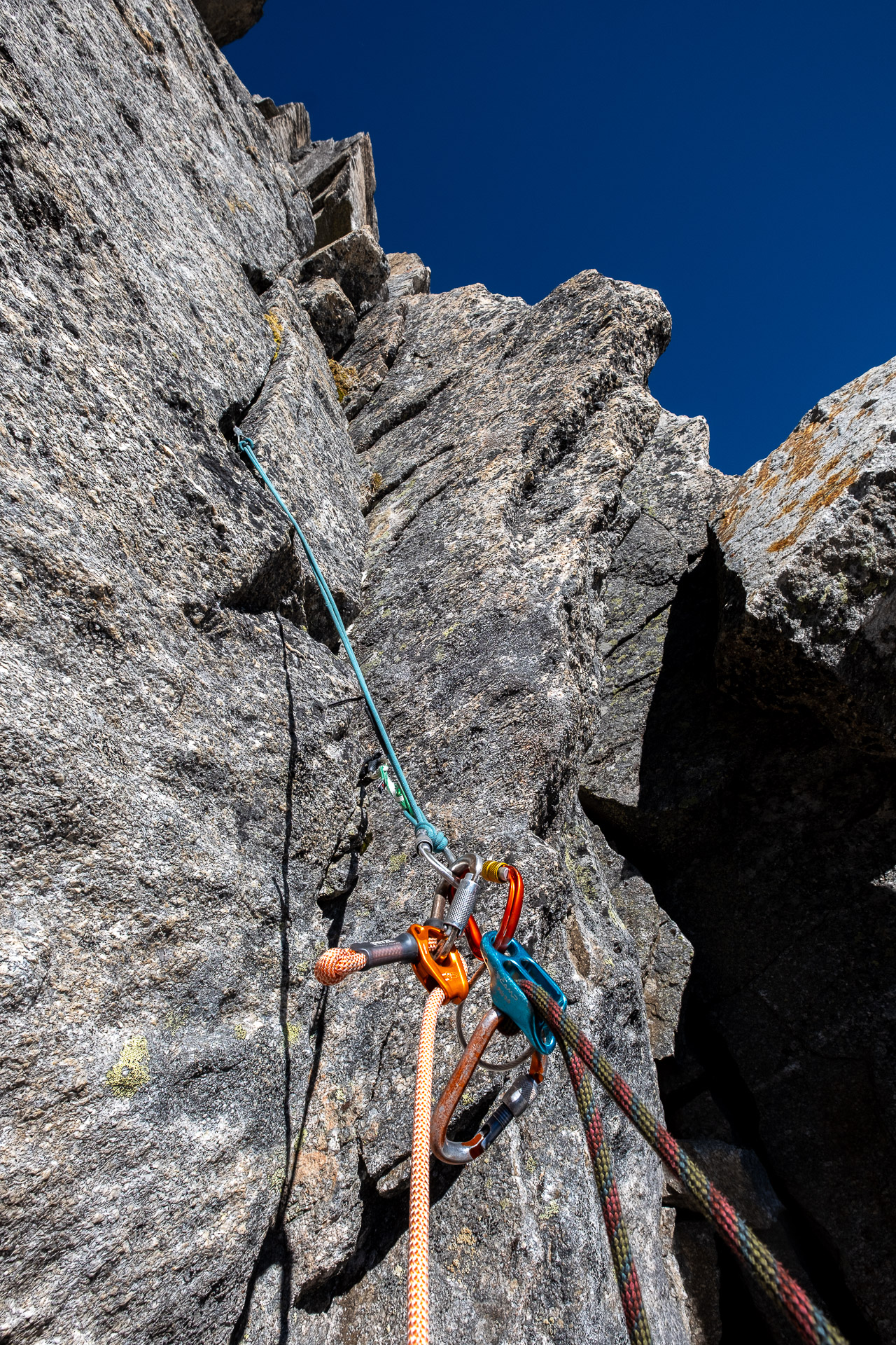 Nástupových variant je několik, my nakonec vybíráme direkt z nejnižšího bodu pilíře a děláme tak z první délky neoficiální klíčovou. Proběhneme kolem prvního štandu a natáhneme to už snadným terénem k druhému. Tam akorát stihneme pozdravit dva kluky z Německa, kterým, jistě k jejich potěše, budeme dýchat na záda až ke kříži.