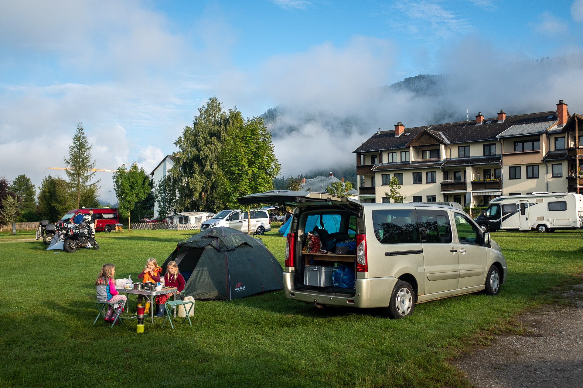 Po předchozích letošních úspěších jsem opět vsadili na kemp. V městečku Mooslandl stavíme stan v Campingu Mooswirt, který je poloprázdný, s vstřícným správcem a ještě navíc s koupákem zdarma. Pro náš amsámbl ideální kombinace. Zrána je naštěstí na cachtání moc zima i pro naše kachny a tak vyrážíme na výlet do zapadlého údolí Radmer, které zatím unikalo naší pozornosti.