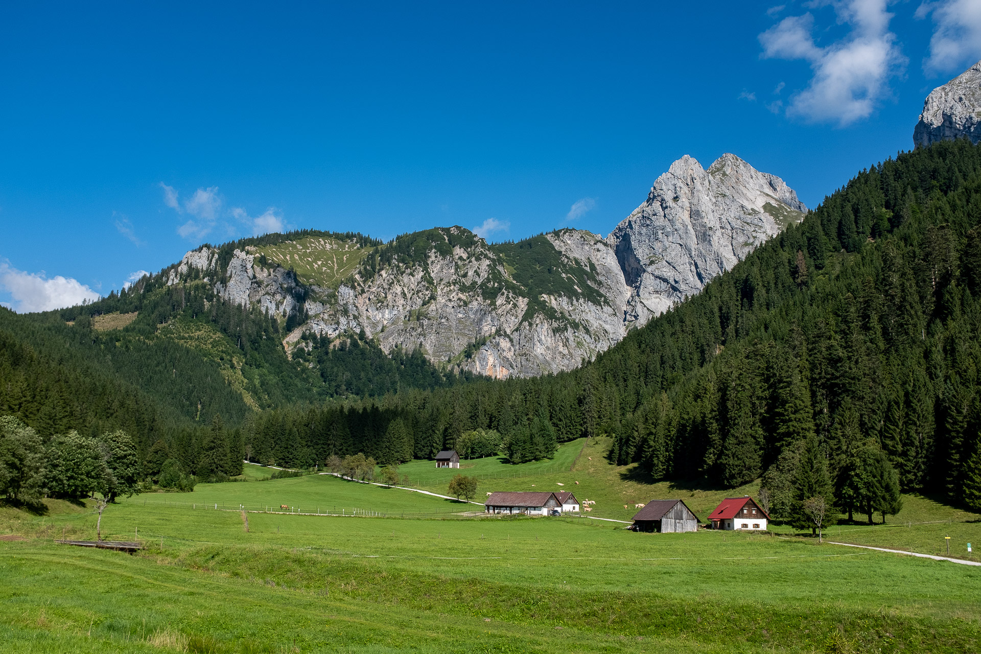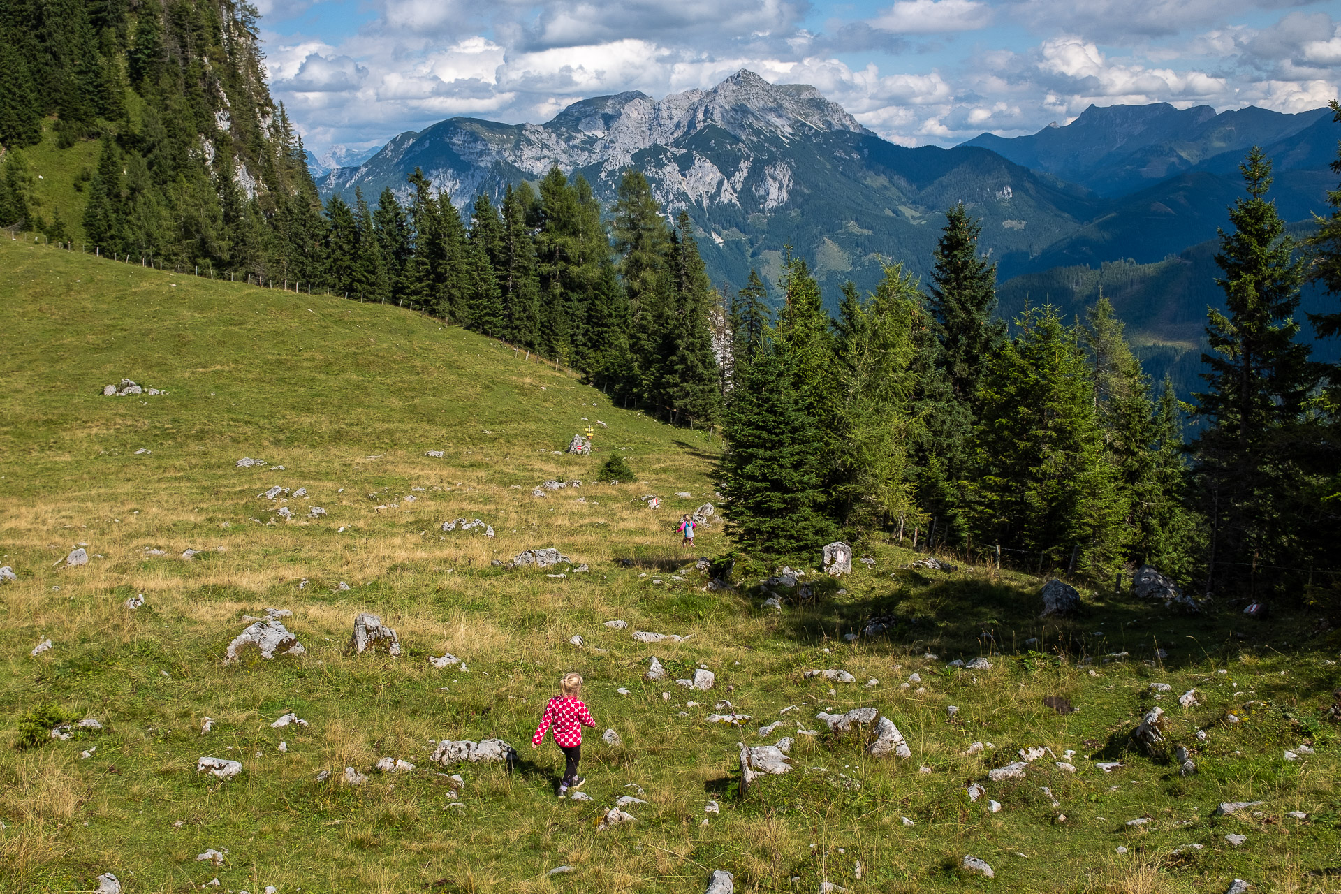 Od Neuburgalmu je to už jen cuby dup do sedla, které známe z kočárových výletů z Johnsbachu. Tentokrát už můžeme zamířit i na jednostopé stezky a tak traverzujeme lesem do vedlejšího sedla Gespitzter Stein (1556 m). Zprvu je to pohodová šumavská procházka, ale v závěru strmost a krkolomnost stoupá a jsme rádi, když se v pořádku vyloupneme na louce nad sedlem.