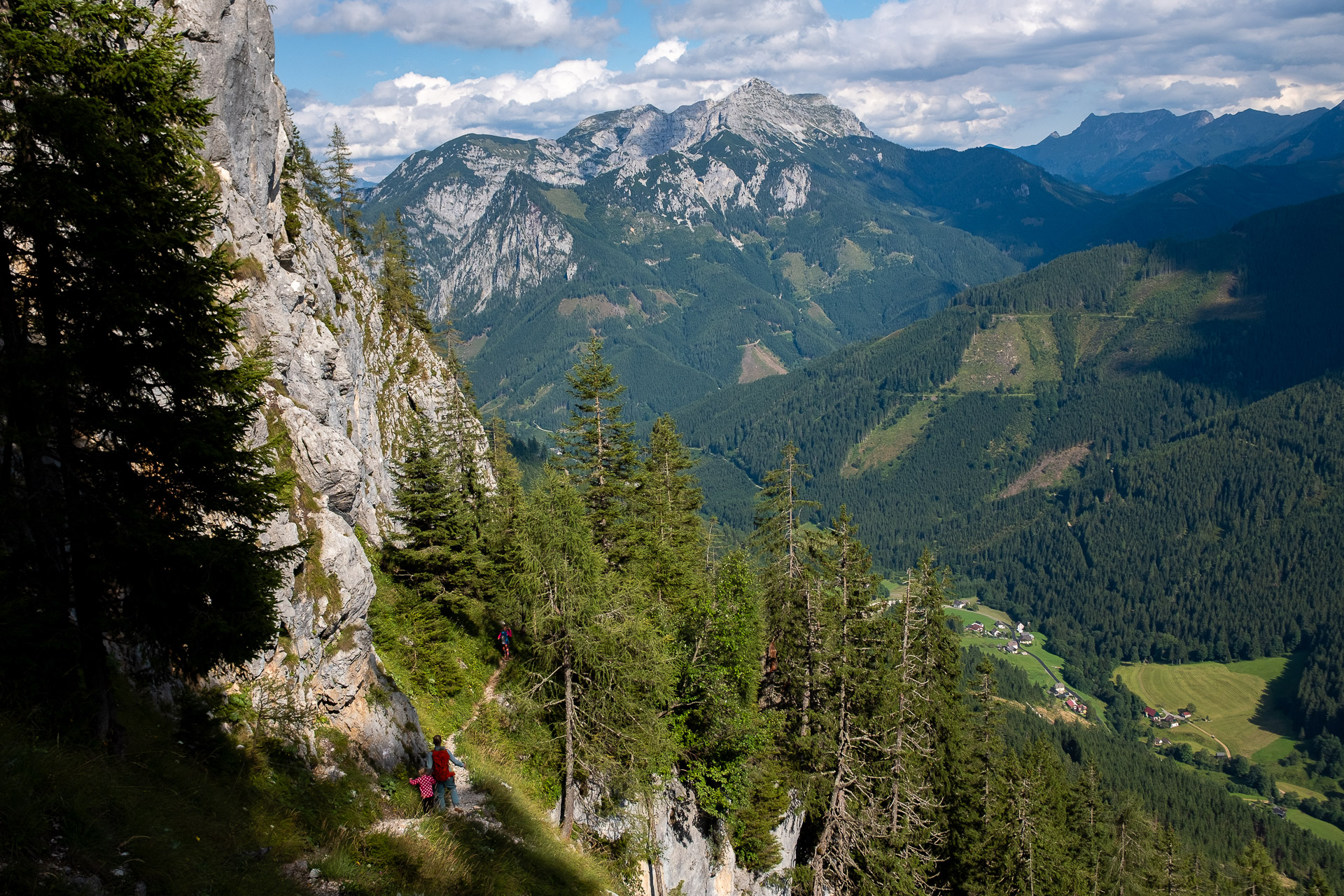 Jen co se na skok podíváme do národního parku Gesäuse, hned z něj zase pelášíme pryč. Sestupujeme na jih, do Radmeru. Na svou kilometrech musíme ztratit 650 vejškovejch, takže je to zase fest z kopce a hlavně fest ošemetný. Na úzkých policích máme o holky chvílemi trochu strach, ale zkamzíkujou to statečně bez kotrmelců a zdárně uzavíráme dnešní výlet.